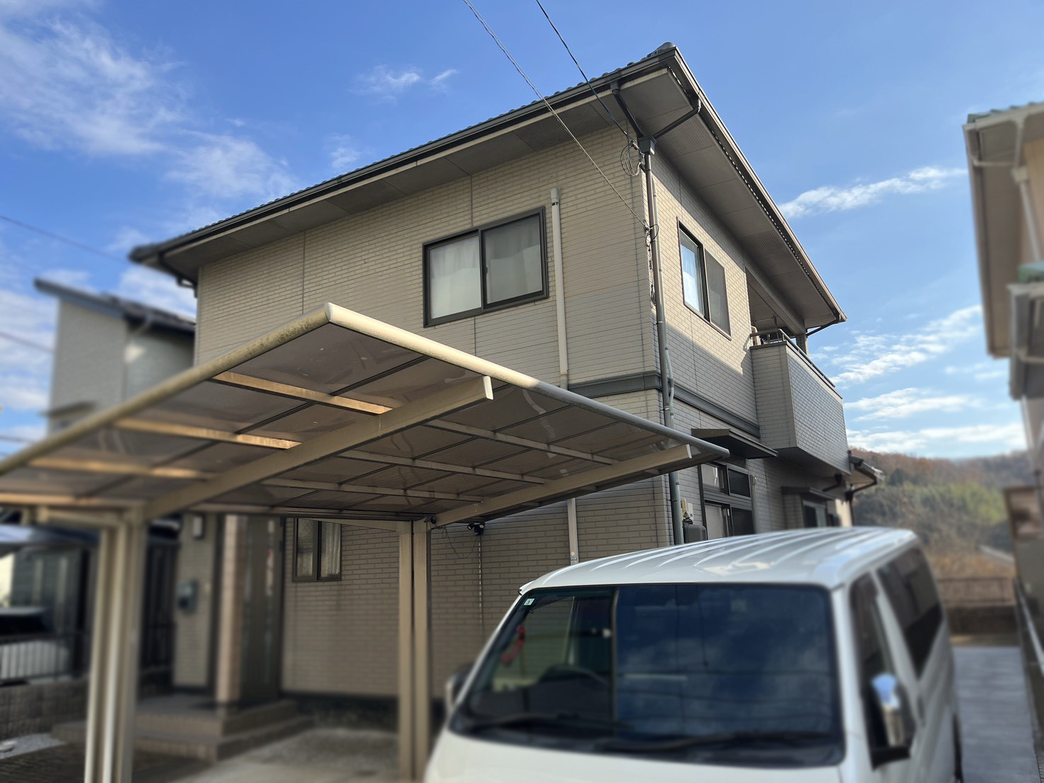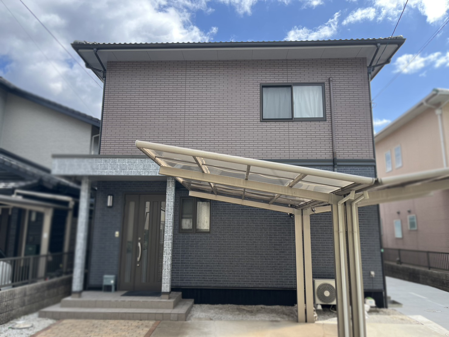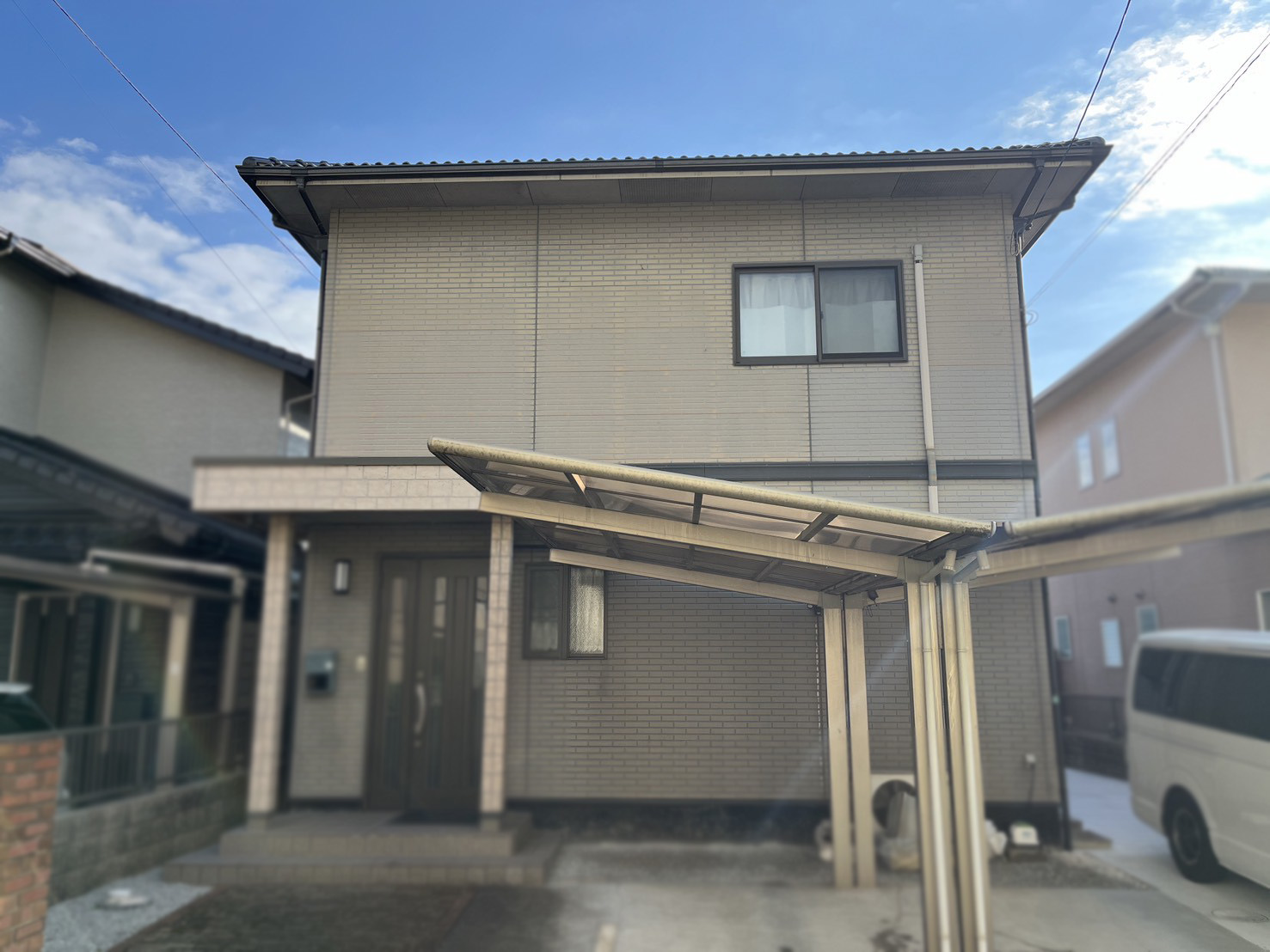 ◇施工前コメント 外壁のチョーキング、コーキングの劣化が進行している状態でした。 ◇施工後コメント 1階壁を2色グラデーション、玄関部を3色グラデーション、2階壁をダブルトーンダイアモンドで施工し、イメージの違うお家へと変貌しました。
